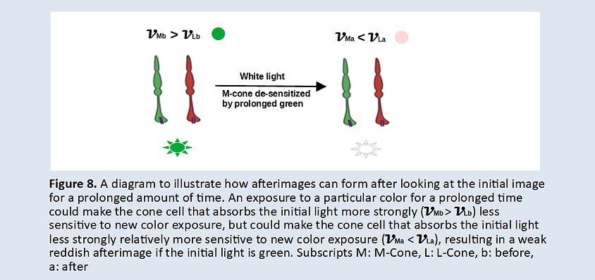 Figure 8 illustrates how an afterimage could form after a prolonged exposure to green light. When exposing to green light, M-cone, which absorbs green light more strongly than L-cone, produces a membrane potential 𝝂M, which is greater than the membrane potential 𝝂L produced by L-cone. Upon prolonged exposure to green light, M-cone becomes less sensitive to new color exposure, in this case, the white light. This makes L-cone relatively more sensitive to the white light. As a result, the sizes of the membrane potentials are reversed from 𝝂Mb > 𝝂Lb to 𝝂Ma < 𝝂La, here subscript b means before, and a means after. The direct consequence of this reverse is temporarily shifting λ from green zone into the weak reddish zone, which is perceived as a weak reddish afterimage.